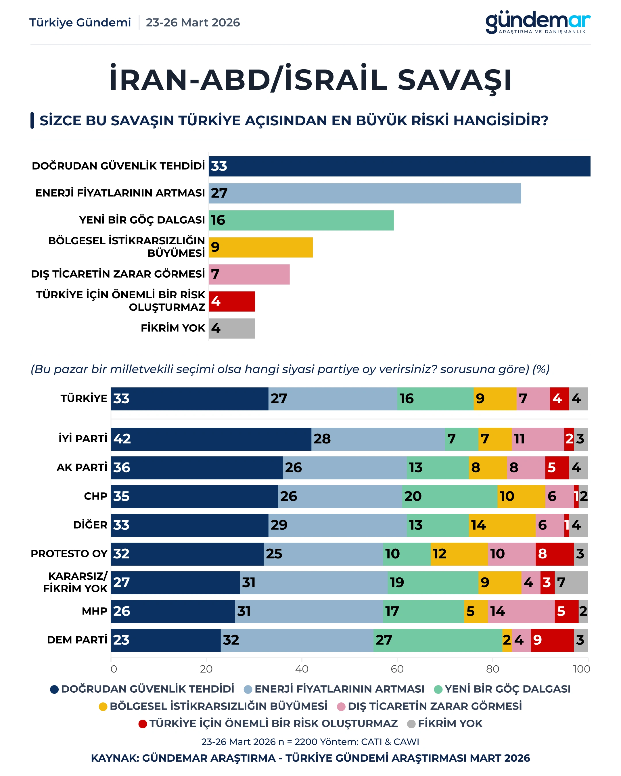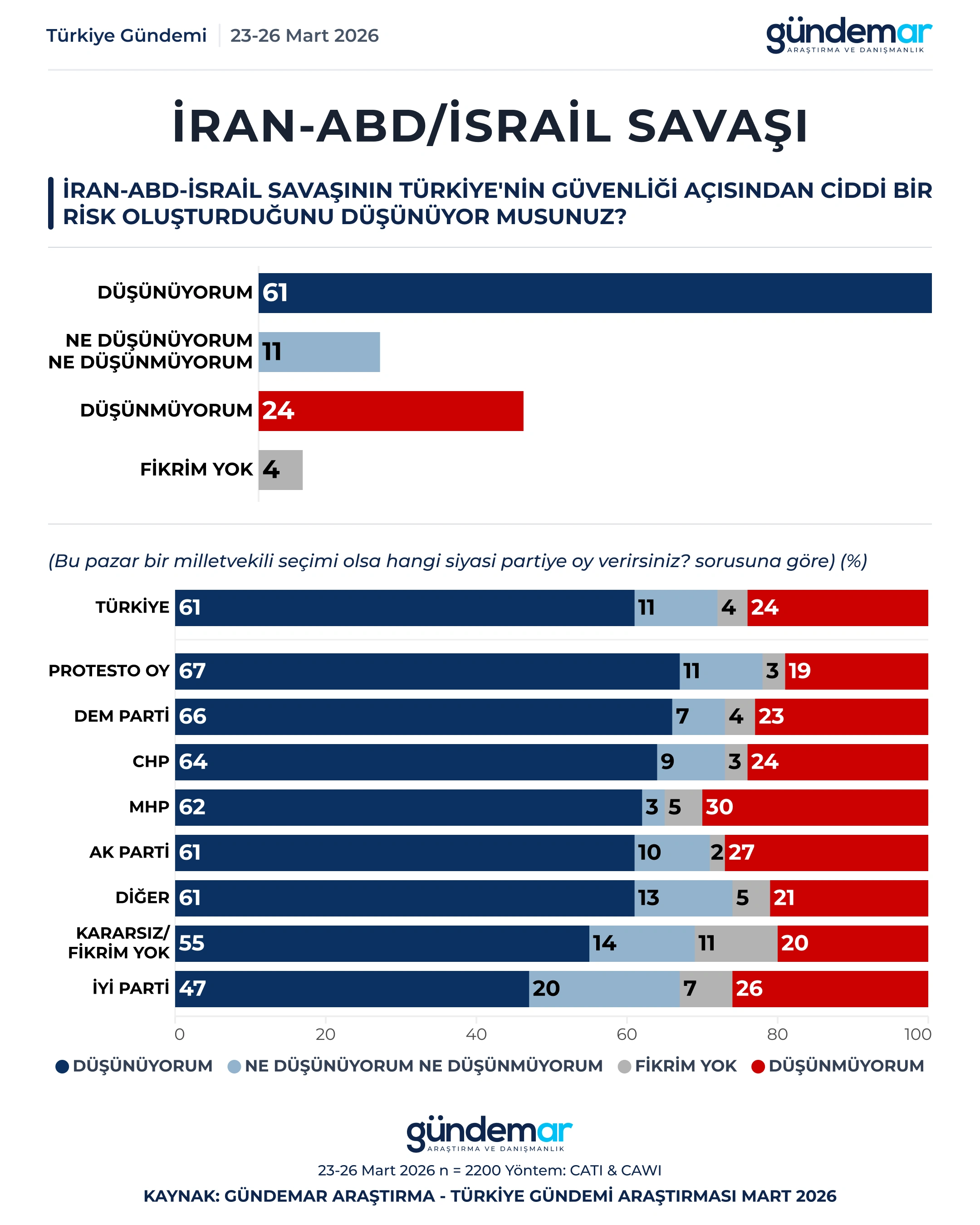 GÜNDEMAR Araştırma’nın 23-26 Mart 2026 tarihleri arasında 60 ilde 2.200 kişiyle gerçekleştirdiği Türkiye Gündemi Araştırması, toplumun İran ile ABD-İsrail arasındaki savaşı hem doğrudan güvenlik riski hem de hayat pahalılığı tehdidi olarak algıladığını ortaya koyuyor. Bulgular, toplumun ezici çoğunluğunun çatışmanın tarafı olunmamasını, diplomatik dengenin korunmasını, sınır güvenliği ile risk yönetimini önceleyen temkinli bir dış politika çizgisini desteklediğini gösteriyor.