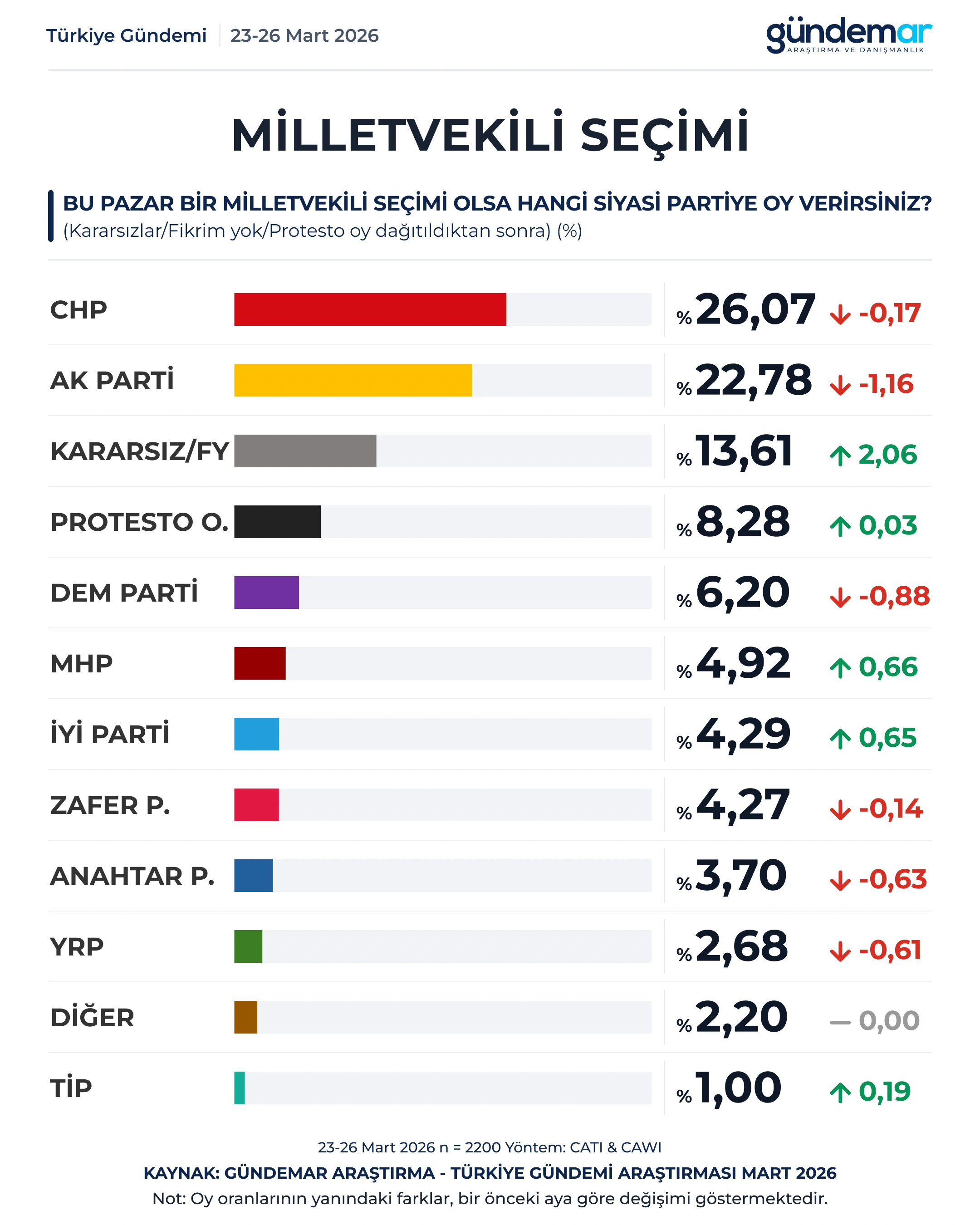 GÜNDEMAR Araştırma’nın 23-26 Mart 2026 tarihleri arasında 2.200 kişiyle gerçekleştirdiği Türkiye Gündemi Araştırması’na göre, kararsızlar, fikrim yok ve protesto oylar dağıtılmadan ölçülen tabloda CHP yüzde 26,07 ile birinci parti konumunda yer alıyor. AK Parti yüzde 22,78 ile ikinci sırada bulunurken; kararsız/fikrim yok yüzde 13,61, protesto oy yüzde 8,28, DEM Parti yüzde 6,20, MHP yüzde 4,92, İYİ Parti yüzde 4,29, Zafer Partisi yüzde 4,27, Anahtar Parti yüzde 3,70, Yeniden Refah Partisi yüzde 2,68, Diğer Partiler yüzde 2,20 ve TİP yüzde 1,00 oranında destek alıyor.