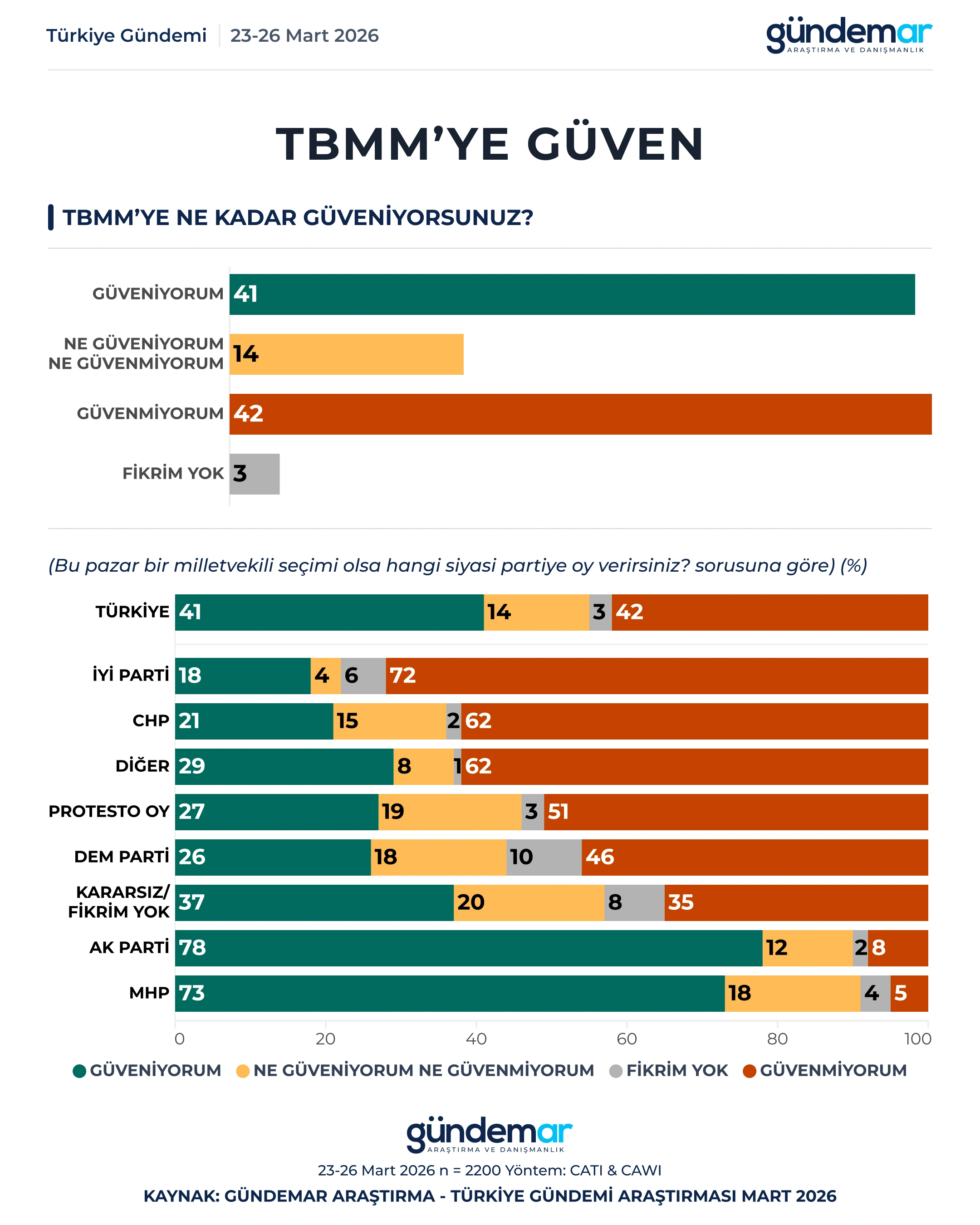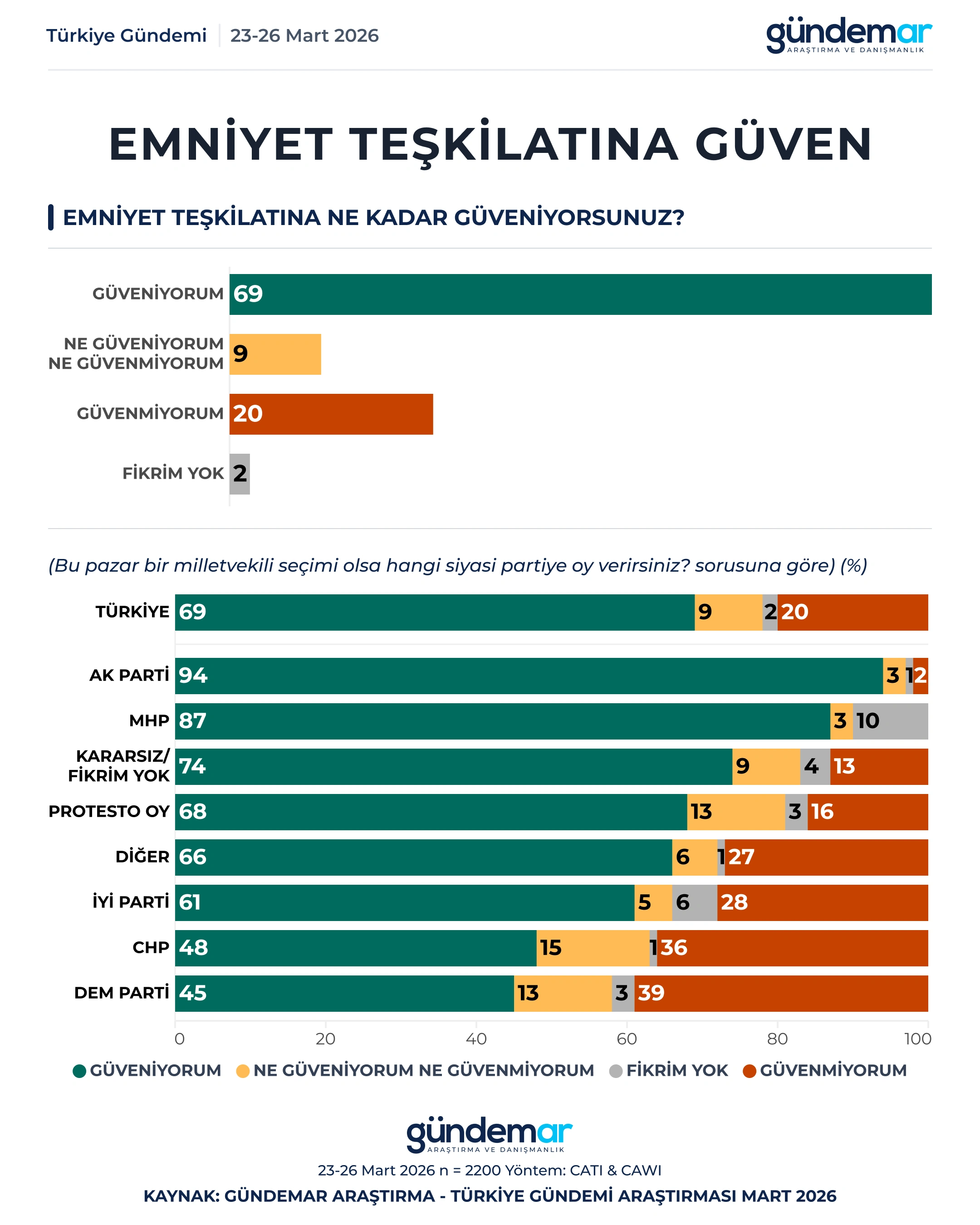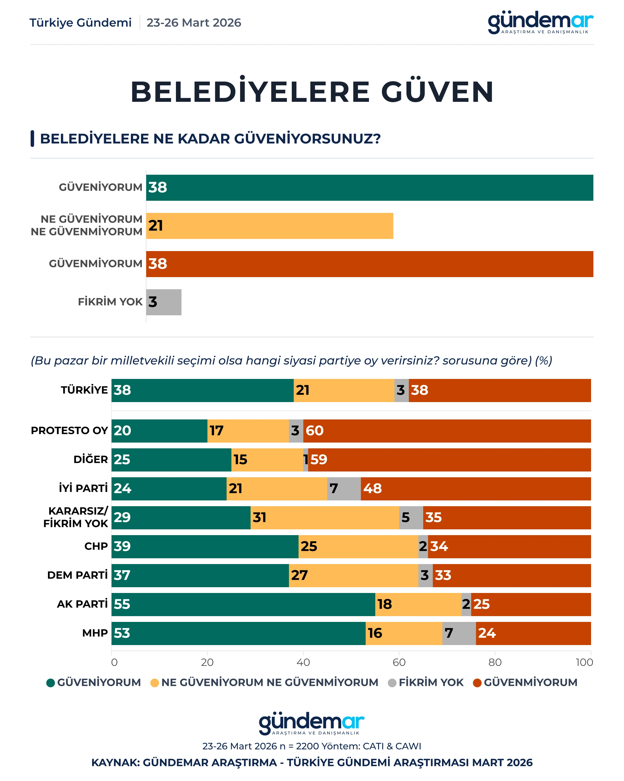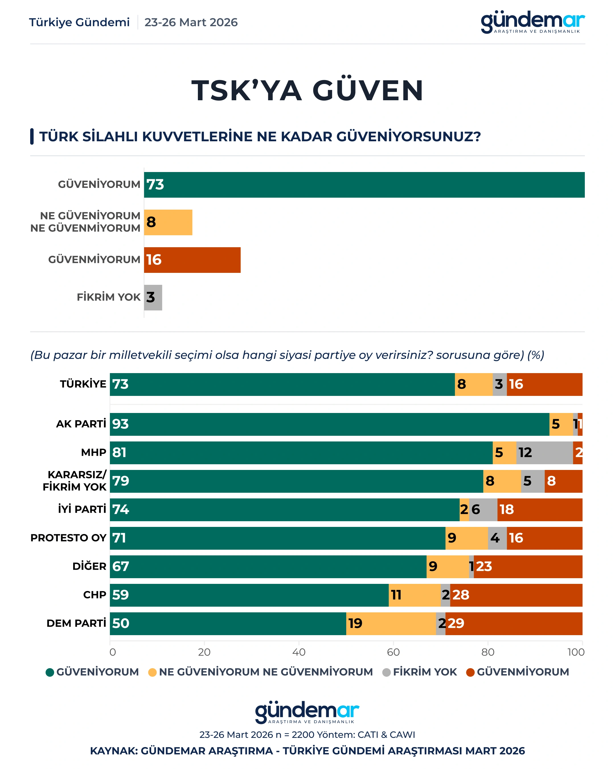 GÜNDEMAR Araştırma 23-26 Mart tarihleri arasında 60 ilde 2200 kişiyle yaptığı “araştırmada kurumlara güven” düzeyini ölçtü.