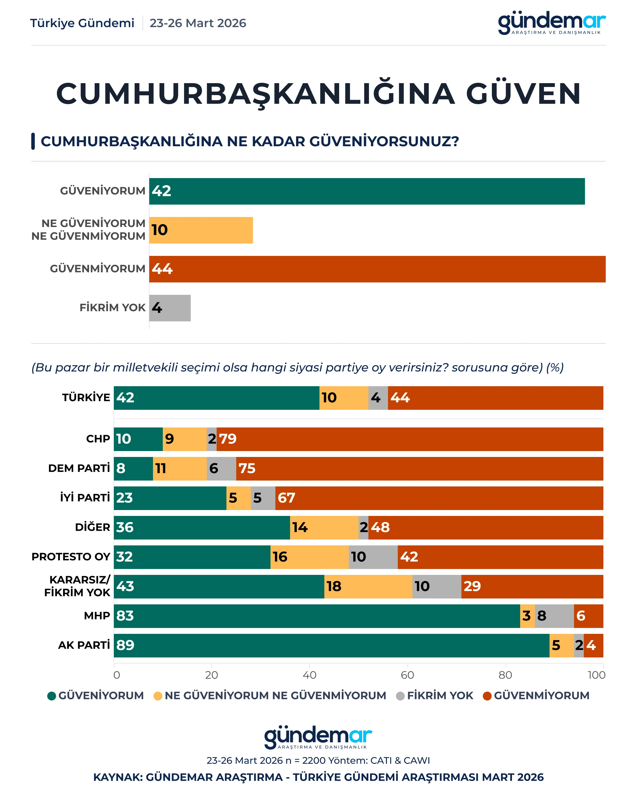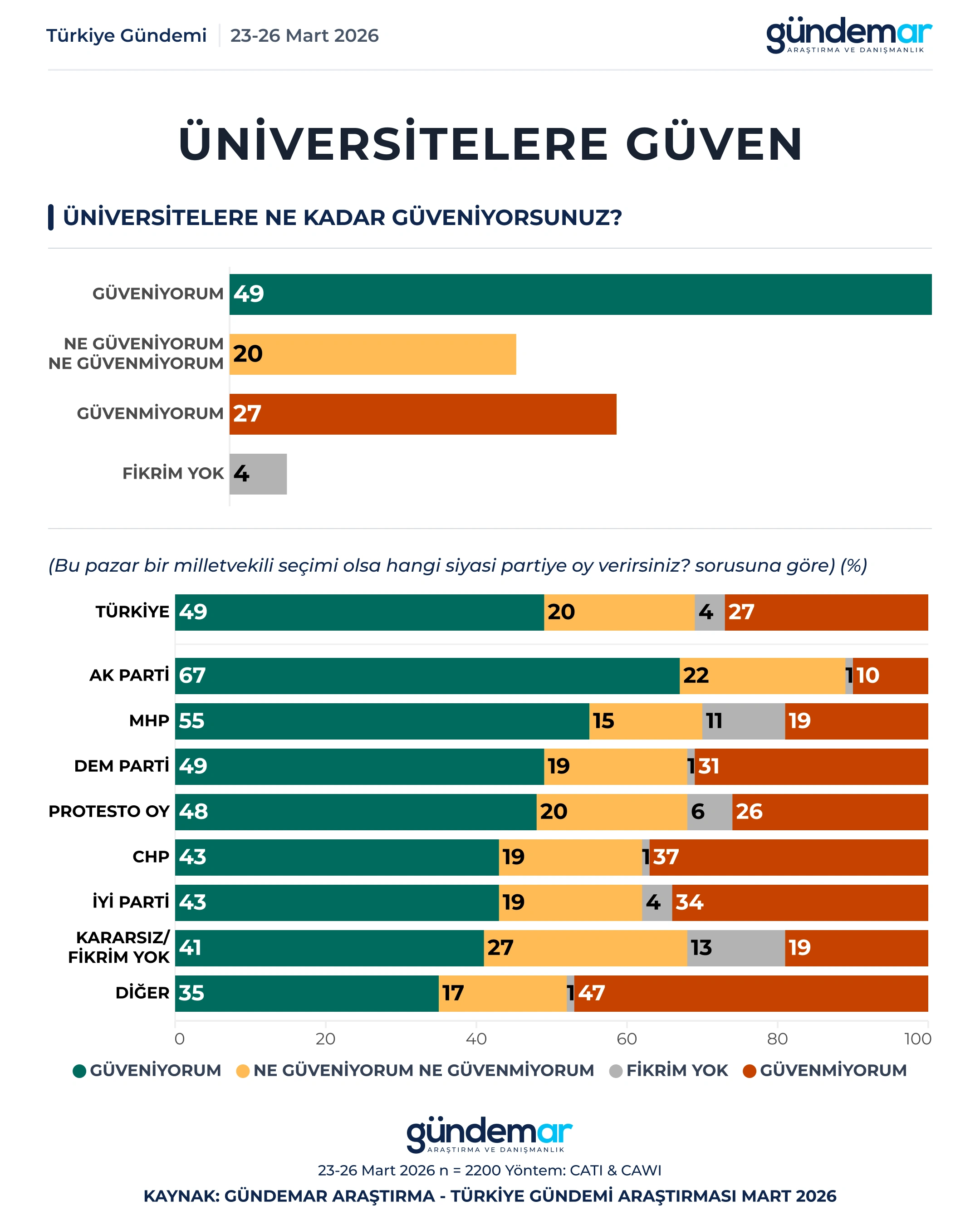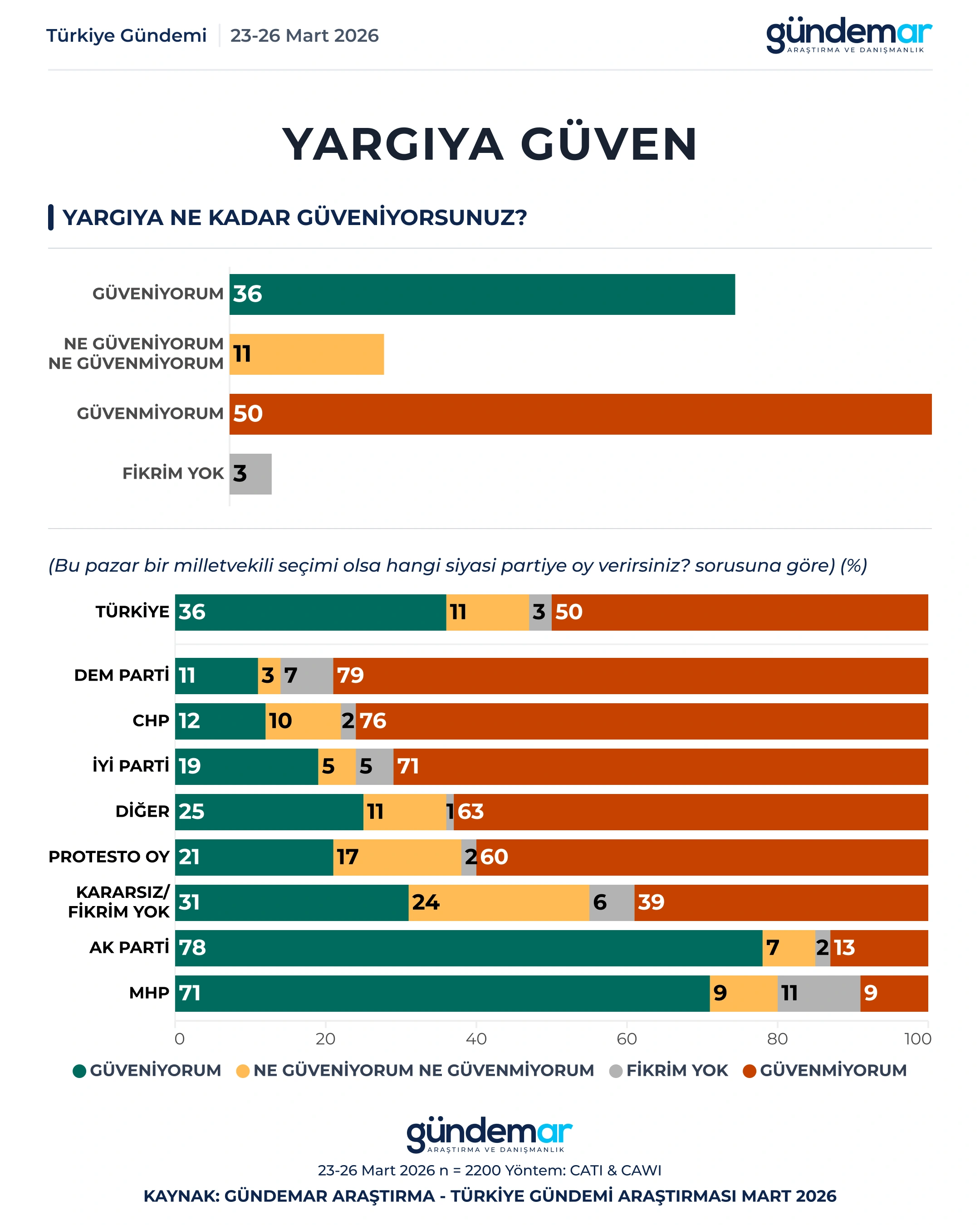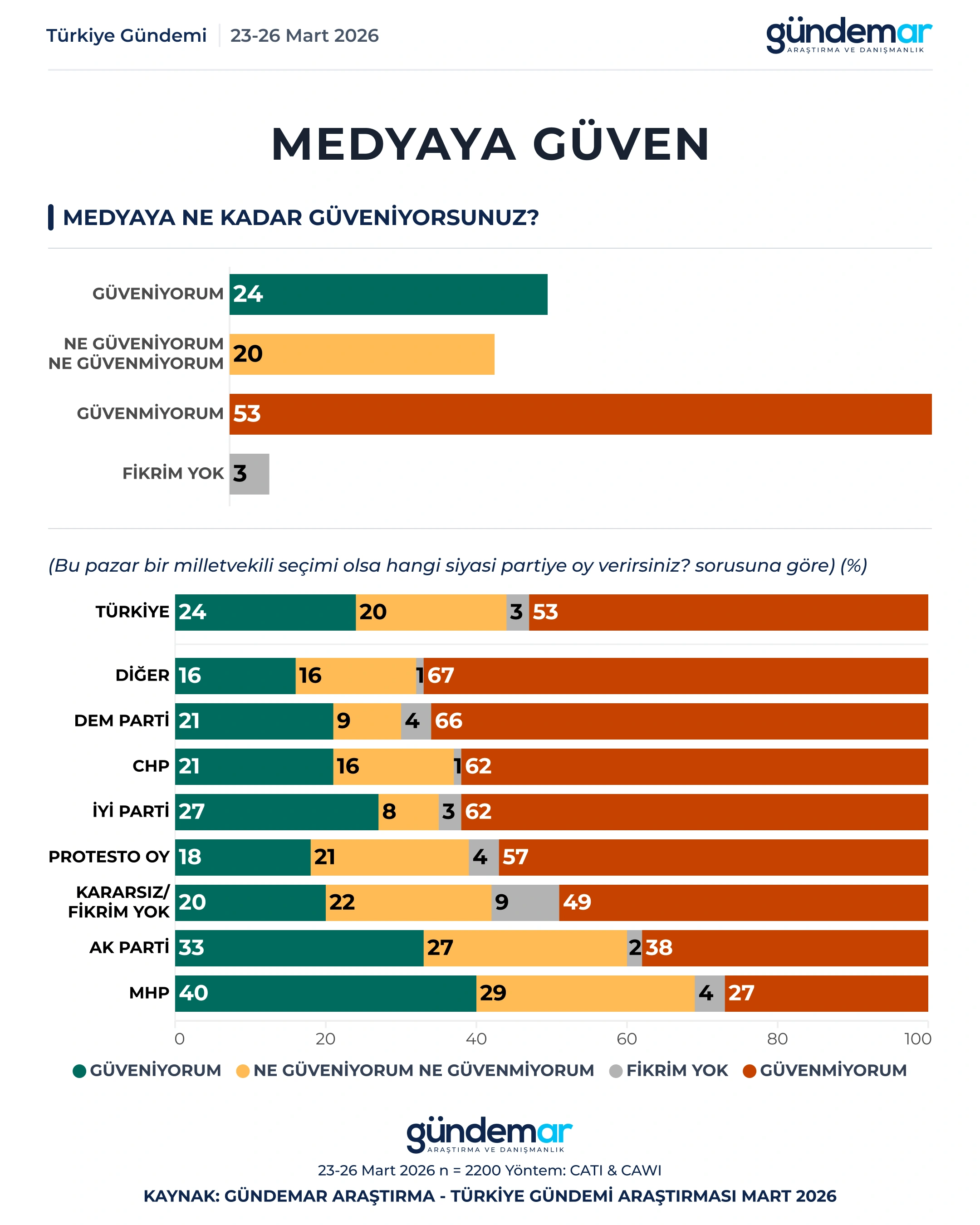 GÜNDEMAR Araştırma 23-26 Mart tarihleri arasında 60 ilde 2200 kişiyle yaptığı “araştırmada kurumlara güven” düzeyini ölçtü.
