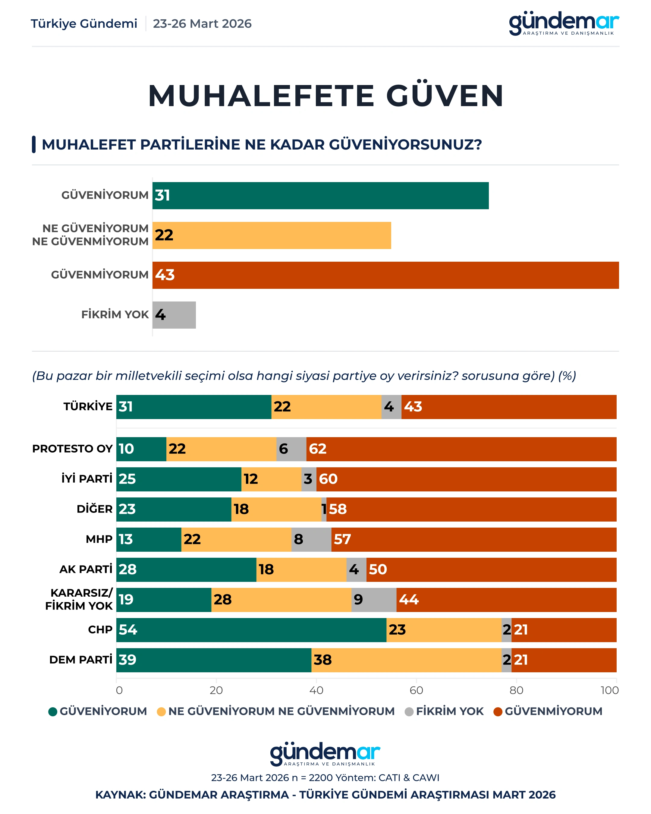 Katılımcılara, “Muhalefete ne kadar güveniyorsunuz?” sorusu yöneltildiğinde ise ‘Güveniyorum’ diyenler yüzde 31, ‘Ne güveniyorum ne güvenmiyorum’ diyenler yüzde 22, ‘Güvenmiyorum’ diyenler yüzde 43, ‘Fikrim yok’ diyenler yüzde 4 oranında olmuştur.