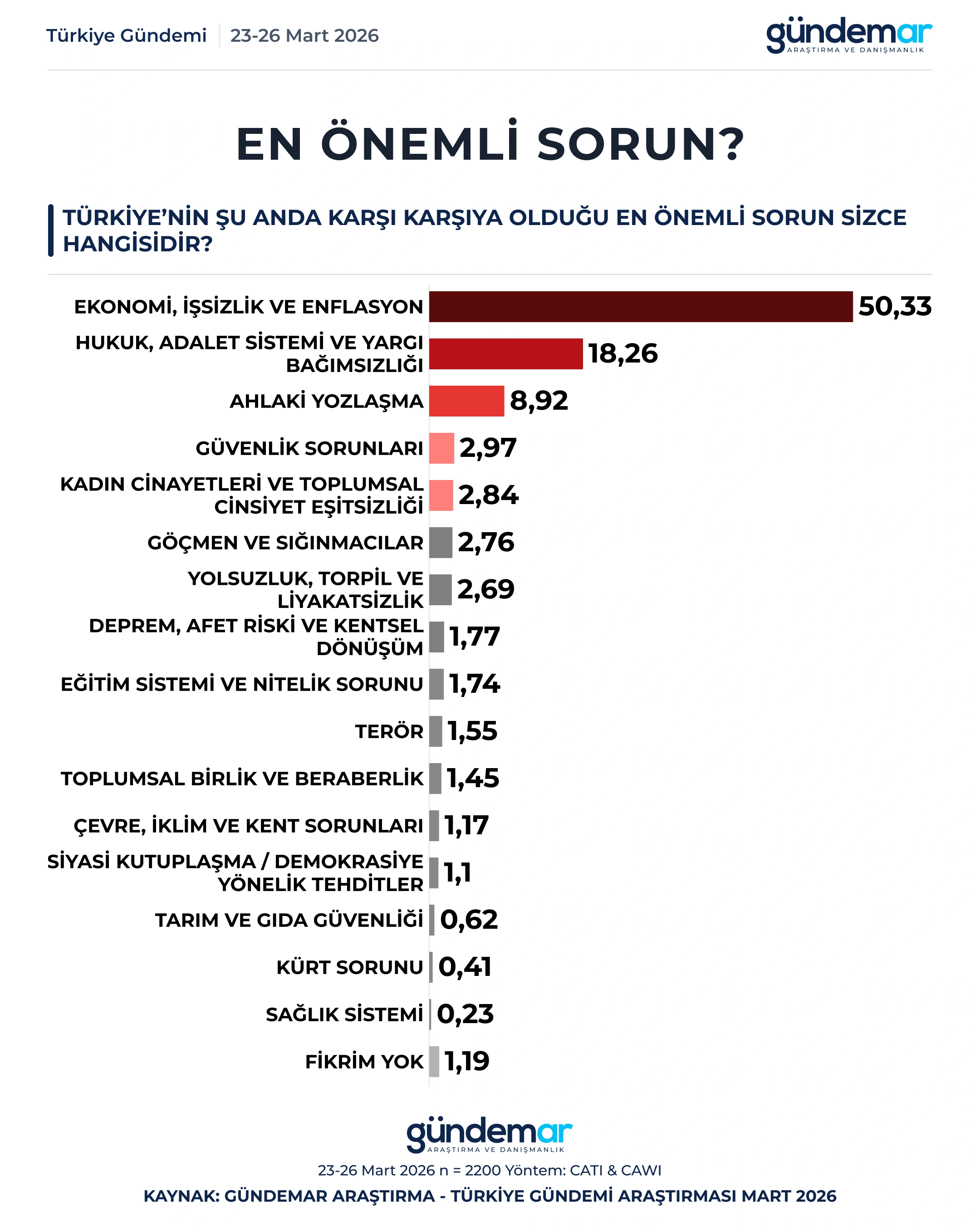 ‘Ekonomi, işsizlik ve enflasyon’ diyenler yüzde 50,33, ‘Hukuk, adalet sistemi ve yargı bağımsızlığı’ diyenler yüzde 18,26, ‘Ahlaki yozlaşma’ diyenler yüzde 8,92, ‘Güvenlik sorunları’ diyenler yüzde 2,97, ‘Kadın cinayetleri ve toplumsal cinsiyet eşitsizliği’ diyenler yüzde 2,84, ‘Göçmen ve sığınmacılar’ diyenler yüzde 2,76, ‘Yolsuzluk, torpil ve liyakatsizlik’ diyenler yüzde 2,69.