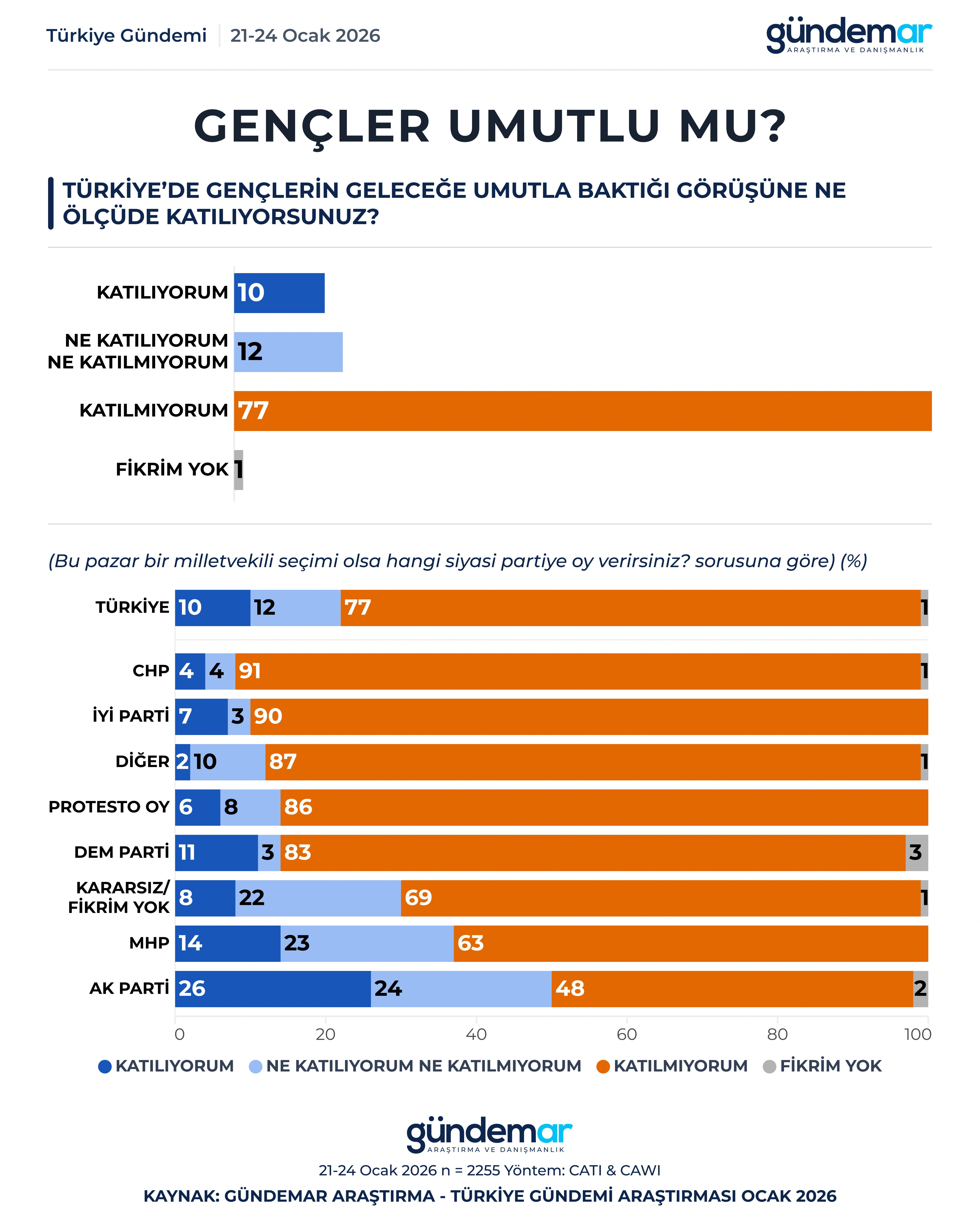 Katılımcıların yüzde 77’si bu görüşe katılmadığını belirtirken, yalnızca yüzde 10’u gençlerin geleceğe umutla baktığını düşünüyor. Yüzde 12’lik bir kesim ise ne katıldığını ne katılmadığını ifade ediyor.