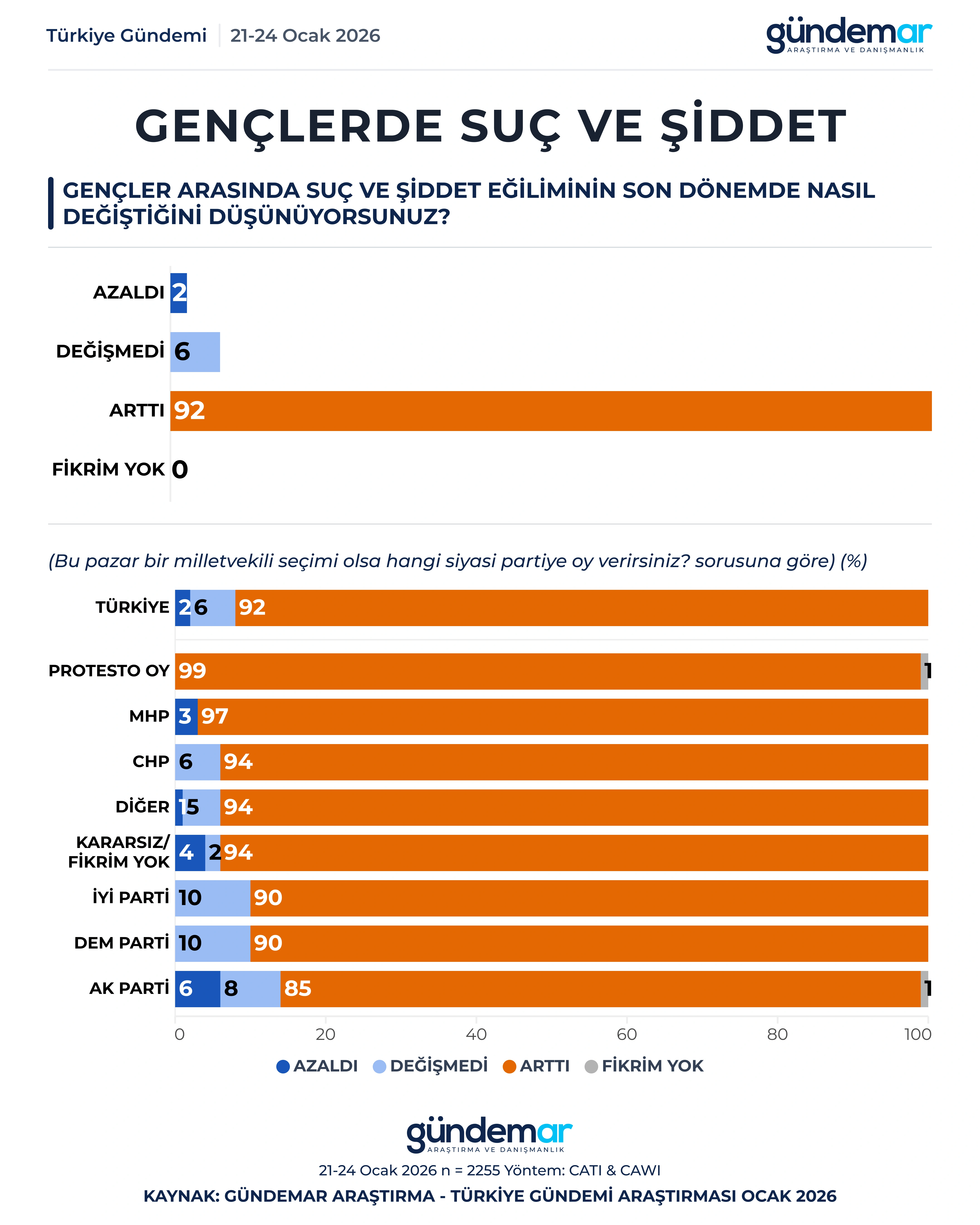 Araştırmanın en çarpıcı bulgularından biri, gençler arasındaki suç ve şiddet eğilimine ilişkin soruda ortaya çıktı. “Gençler arasında suç ve şiddet eğiliminin son dönemde nasıl değiştiğini düşünüyorsunuz?” sorusuna katılımcıların yüzde 92’si ‘arttı’ yanıtını verdi.