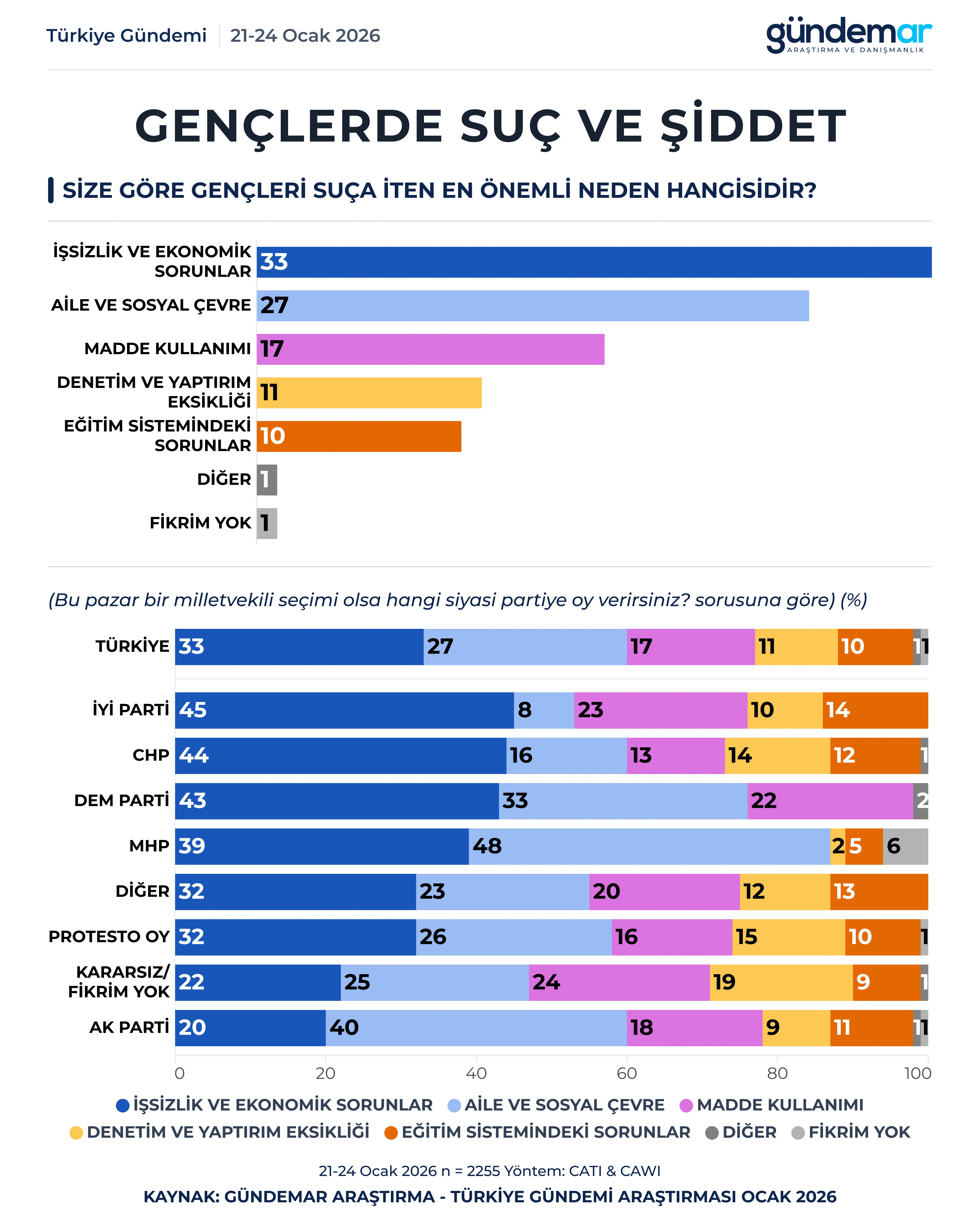 Bu bulgu, kamuoyunun gençlerde suç ve şiddet eğilimini yalnızca bireysel tercihlerle açıklamadığını; ekonomik daralma, aile yapısı, sosyal çevre ve bağımlılık gibi yapısal nedenleri de güçlü biçimde gördüğünü ortaya koyuyor.