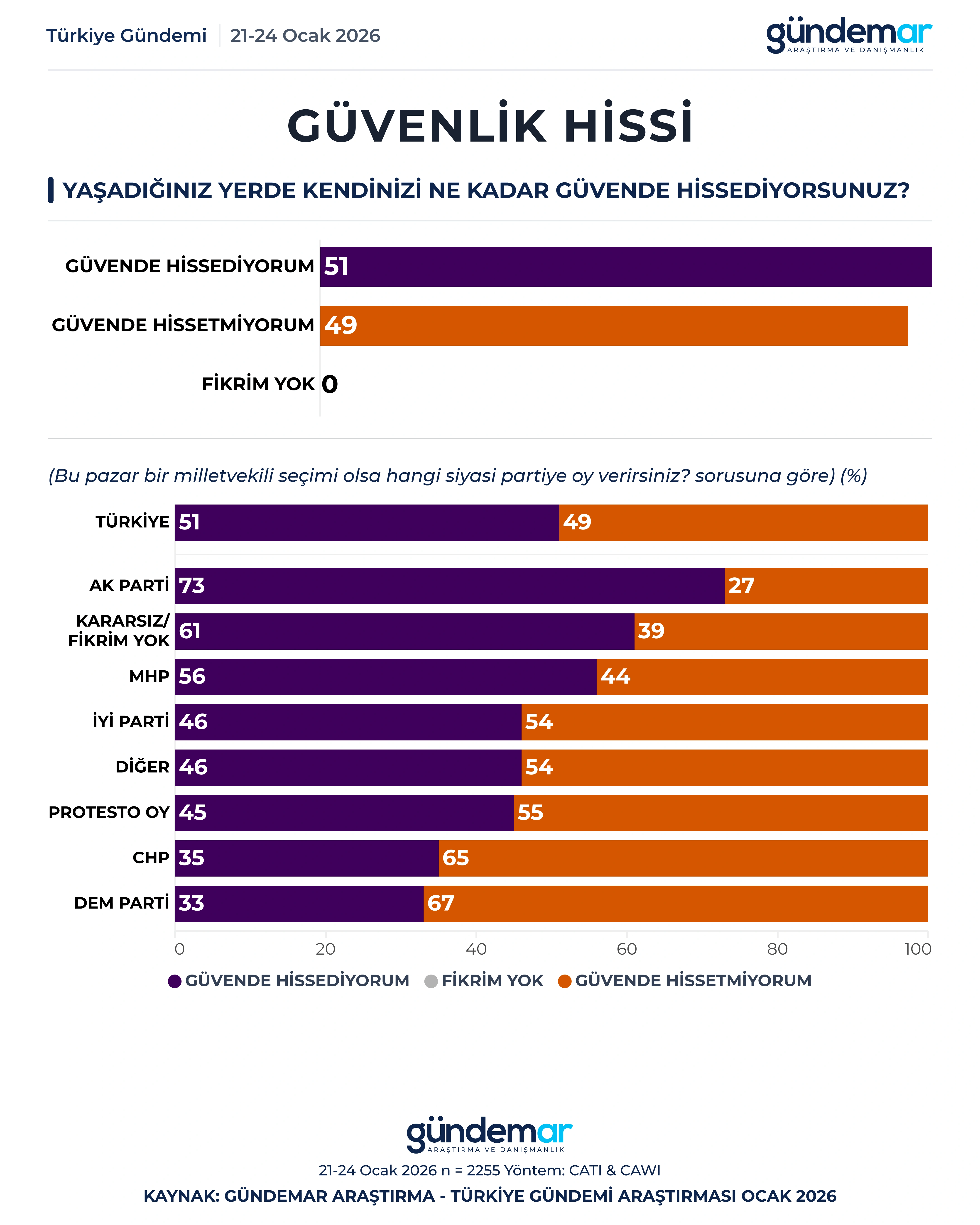 Bu tablo, bireysel güvenlik hissinin artık çok kırılgan bir zeminde durduğunu ve toplumun neredeyse yarısının yaşadığı çevrede güvenlik konusunda tedirginlik taşıdığını ortaya koyuyor.