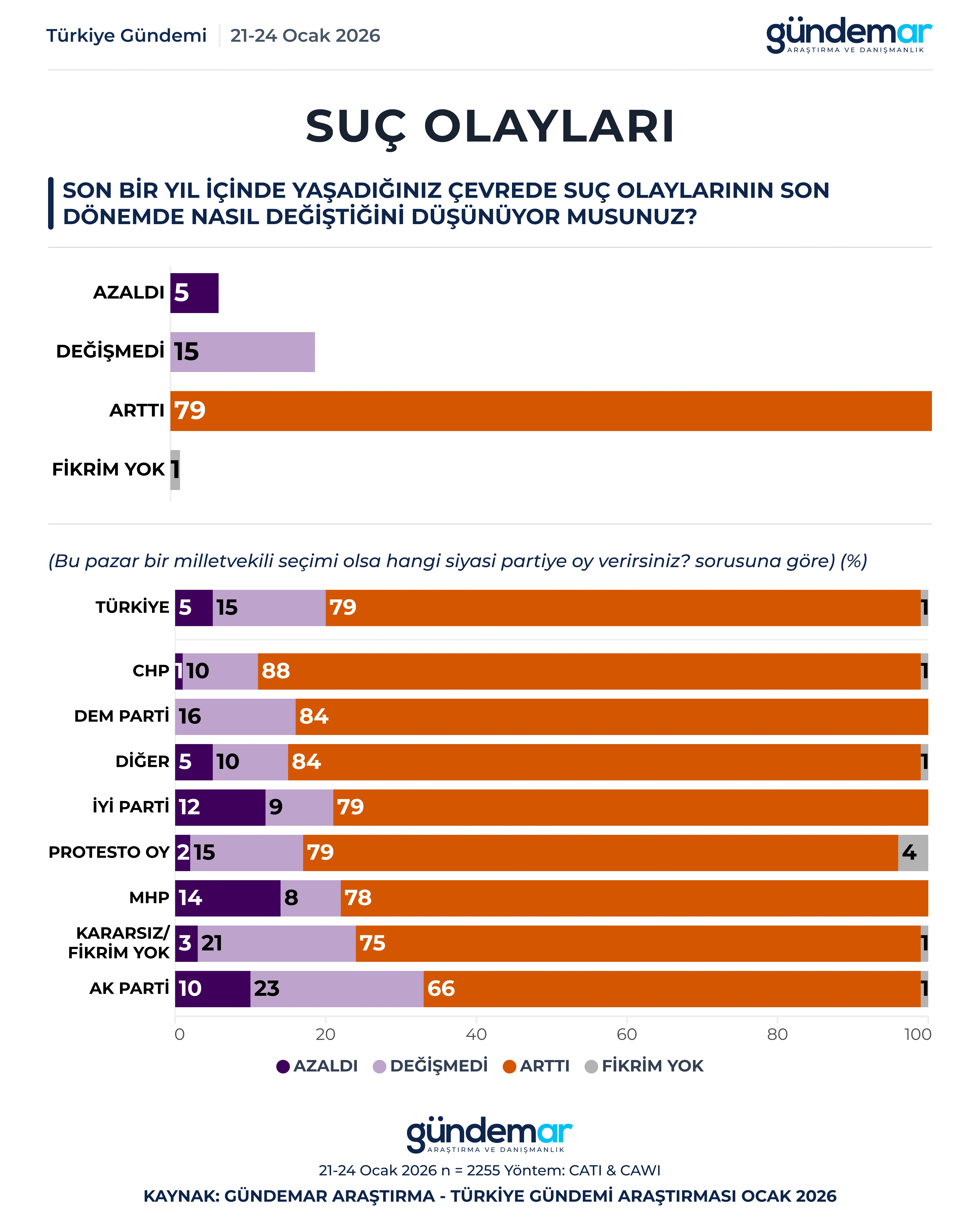 Katılımcıların yüzde 79’u suç olaylarının arttığını belirtirken, yüzde 15’i değişmediğini, yalnızca yüzde 5’i azaldığını ifade ediyor.
