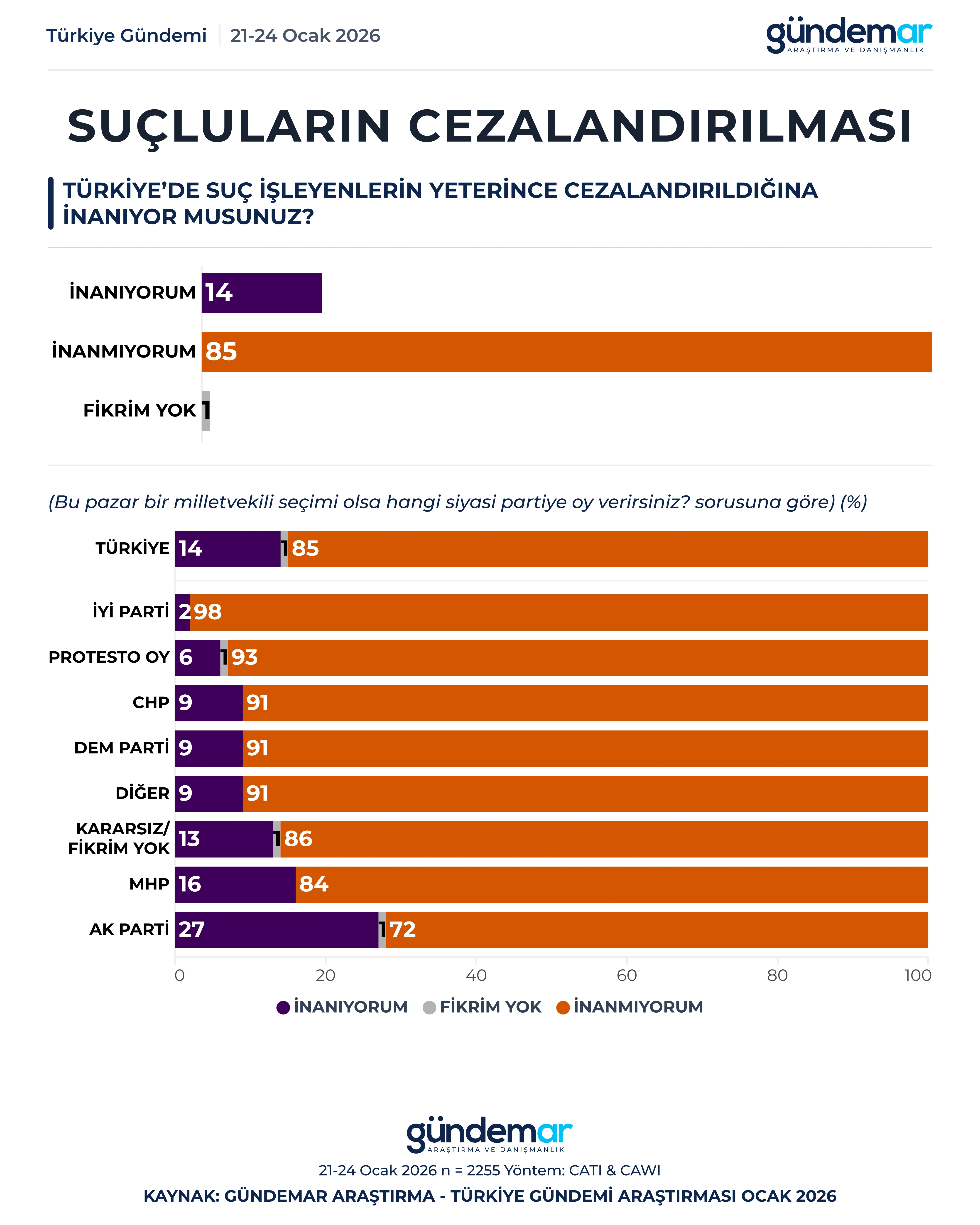 Araştırmada katılımcılara, “Türkiye’de suç işleyenlerin yeterince cezalandırıldığına inanıyor musunuz?” sorusu yöneltildi. Bu soruda ortaya çıkan sonuç, ceza sistemine duyulan güvenin oldukça zayıf olduğunu gösteriyor.Katılımcıların yüzde 85’i suç işleyenlerin yeterince cezalandırılmadığı görüşünde. Buna karşılık yalnızca yüzde 14’lük bir kesim yeterince cezalandırıldıklarına inanıyor.
