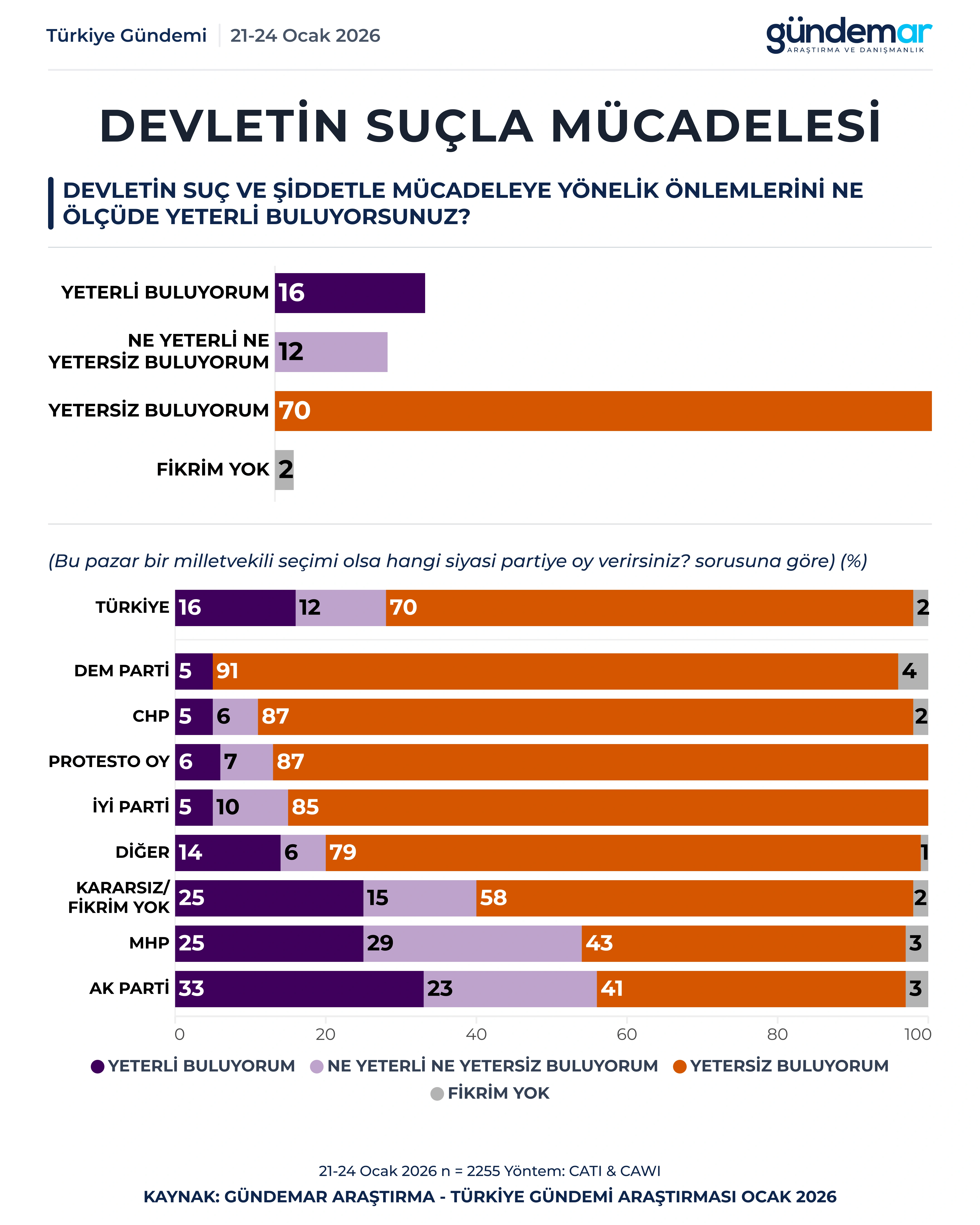 Bu sonuç, kamuoyunun suç ve şiddet meselesinde yalnızca tespit yapmadığını; aynı zamanda mevcut mücadele kapasitesini de ikna edici bulmadığını gösteriyor.